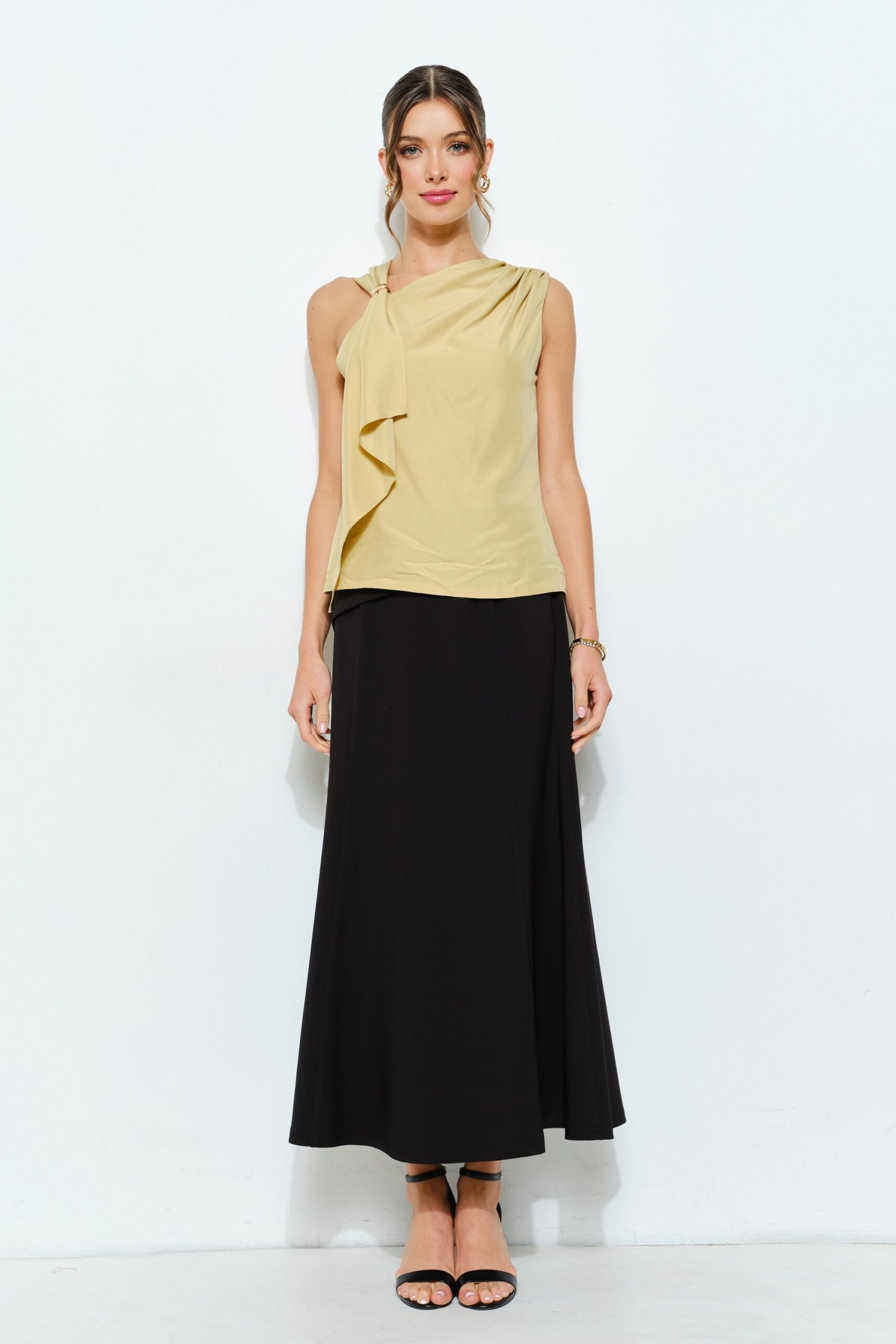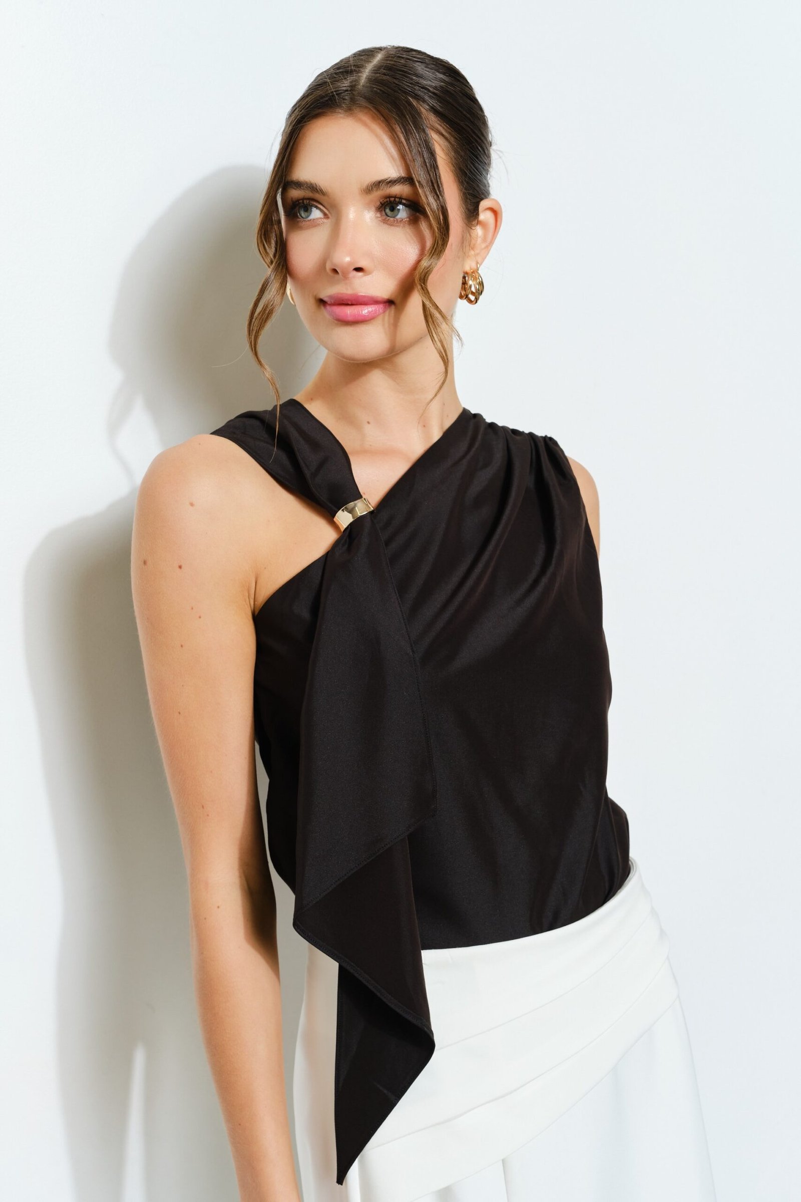 Top con detalle de anillo dorado y escote drapeado asimétrico, tejido ligero con caída suave.